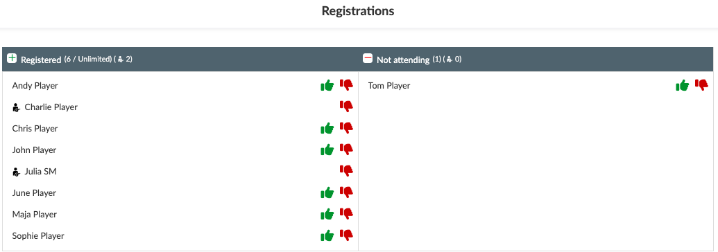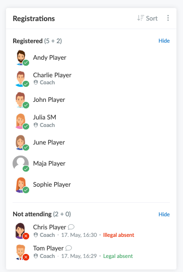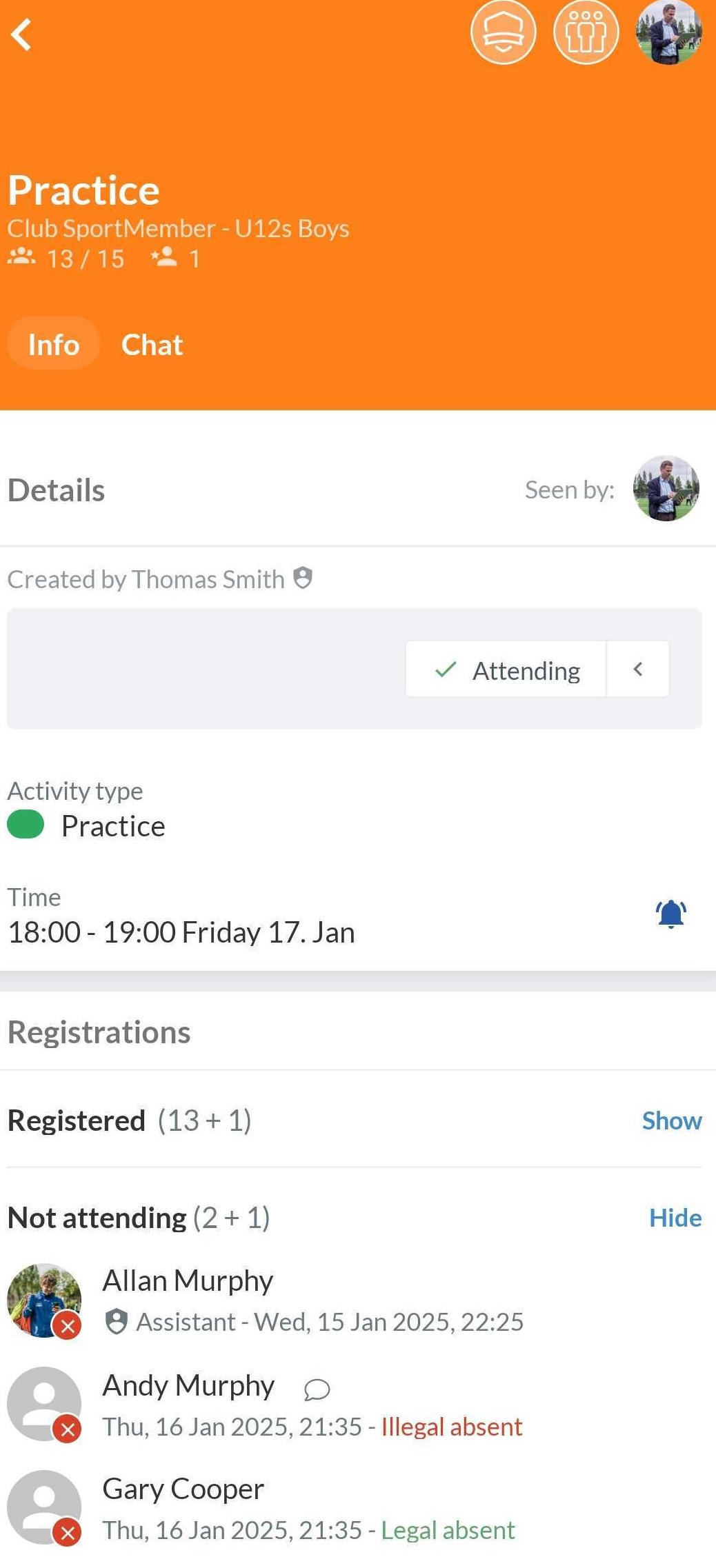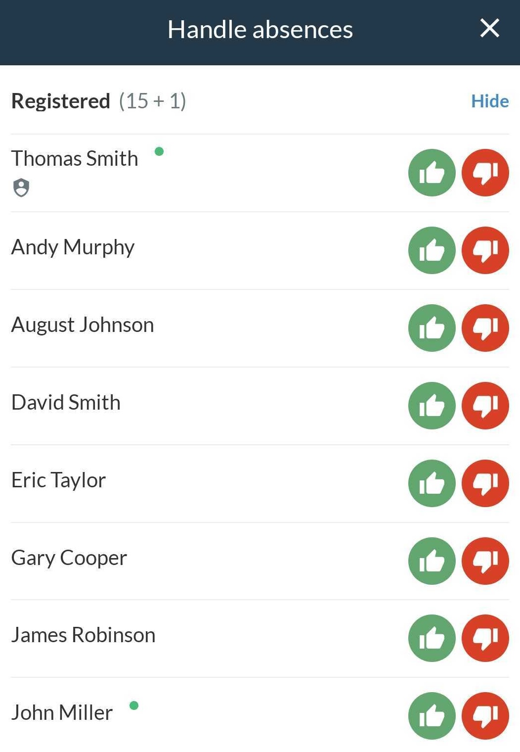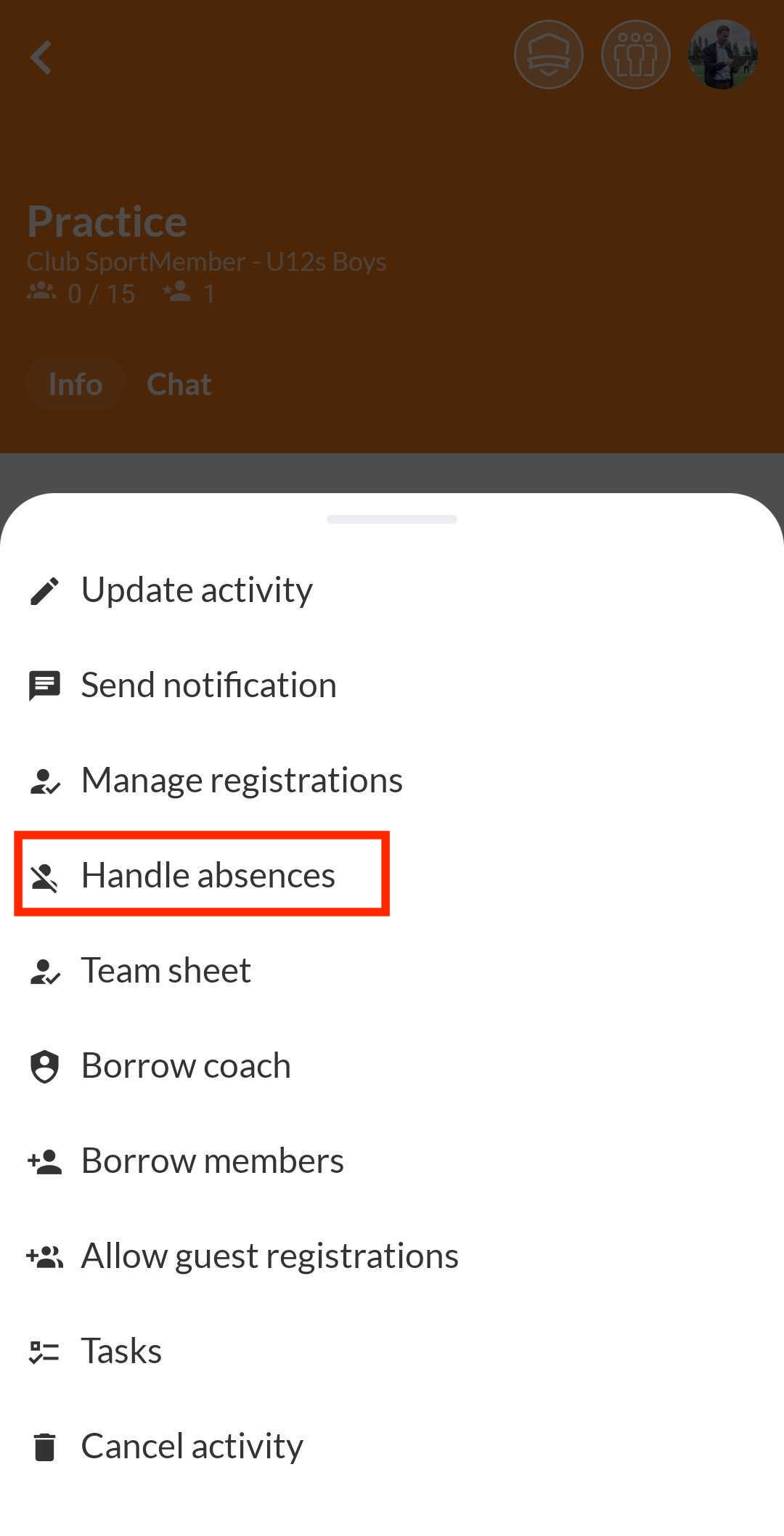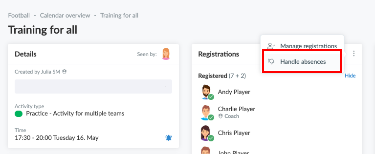 It is possible to record absences within the activity. To do this, open the activity in the (team) calendar as usual.