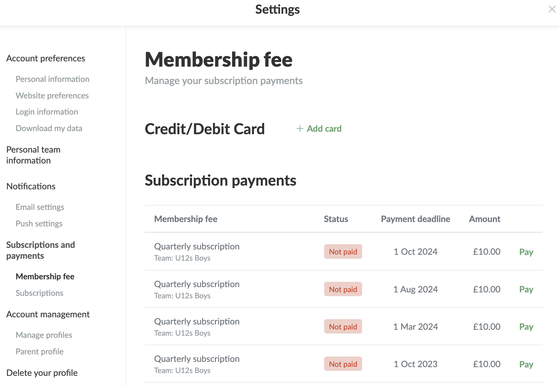 NOTE: The child's outstanding membership fee payment does NOT appear on your parent profile.